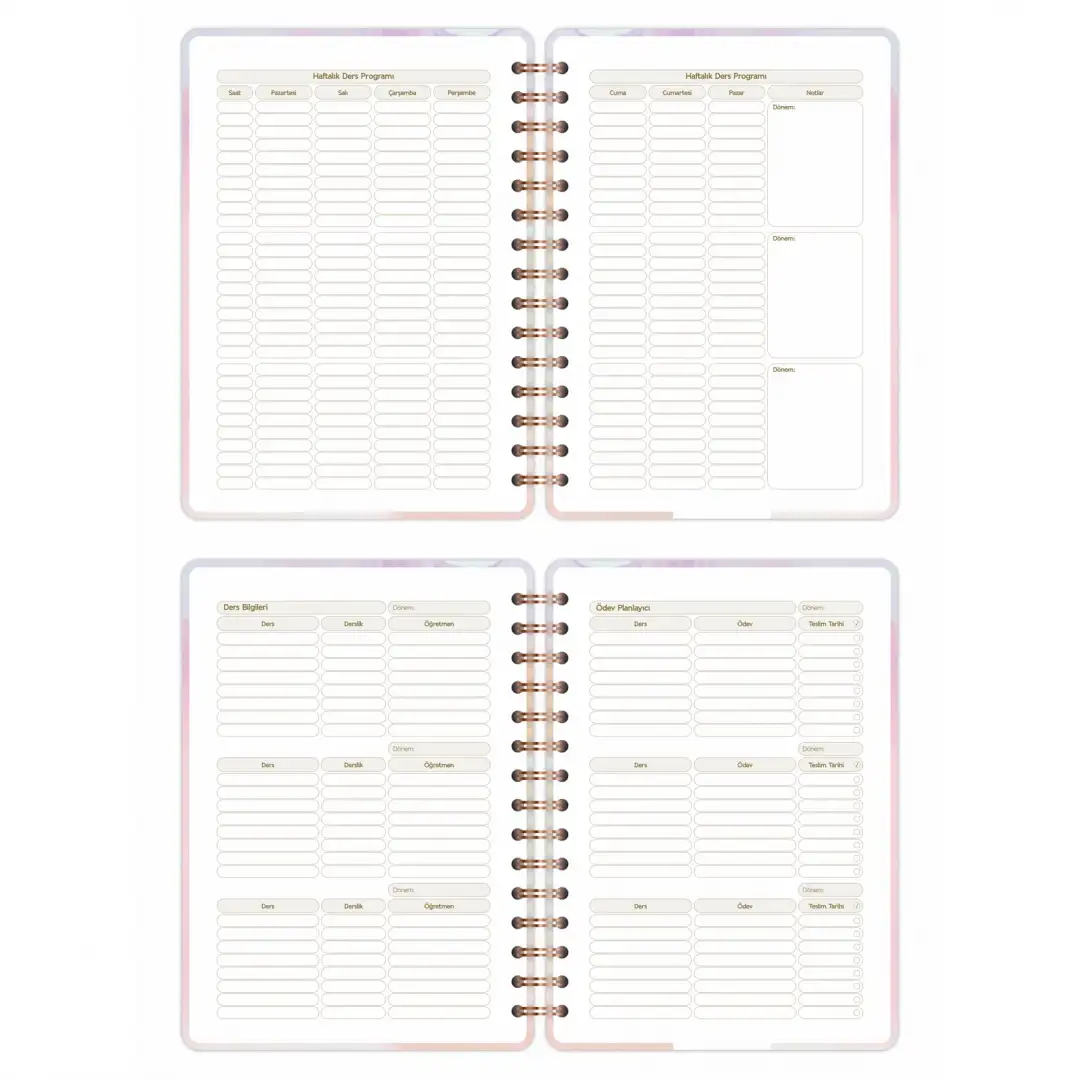 Haftalık ve aylık plan bölümleri ders, sınav ve projelerinizi takip etmenize yardımcı olurken; alışkanlık takibi, motivasyon duvarı, bütçe yönetimi ve ödev çizelgeleri gibi ek alanlar kişisel gelişiminizi destekler.
