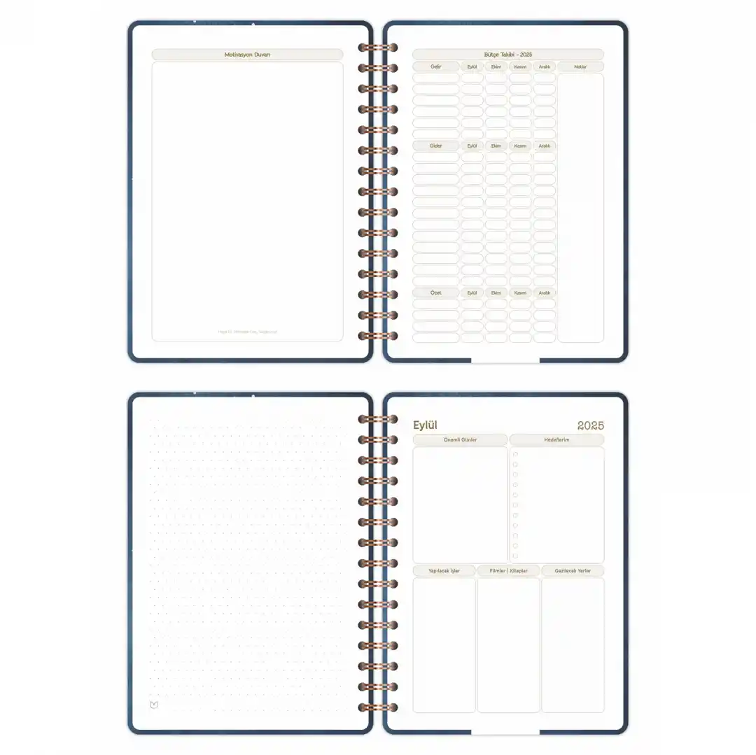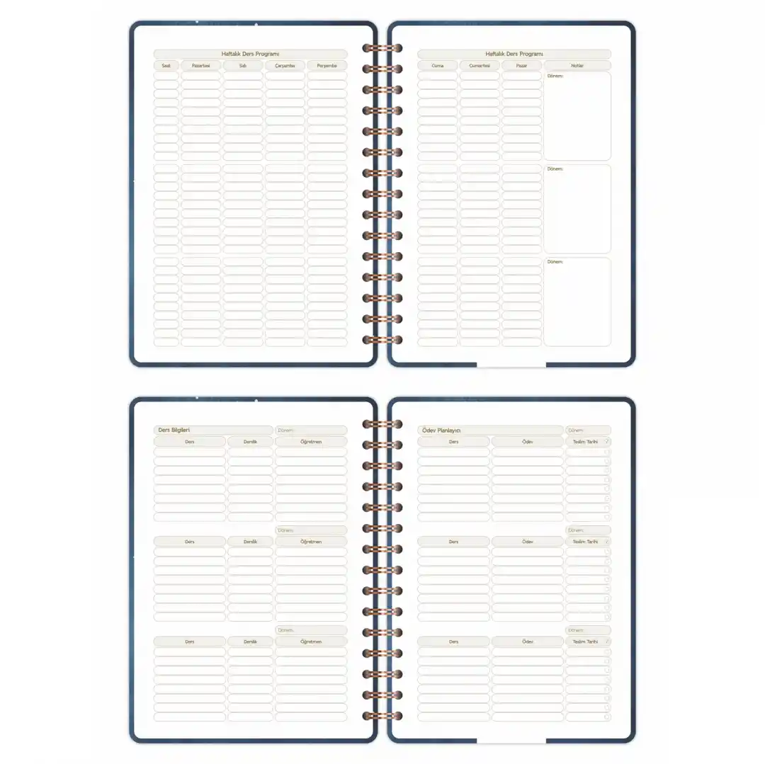 Haftalık ve aylık plan bölümleri ders, sınav ve projelerinizi takip etmenize yardımcı olurken; alışkanlık takibi, motivasyon duvarı, bütçe yönetimi ve ödev çizelgeleri gibi ek alanlar kişisel gelişiminizi destekler.