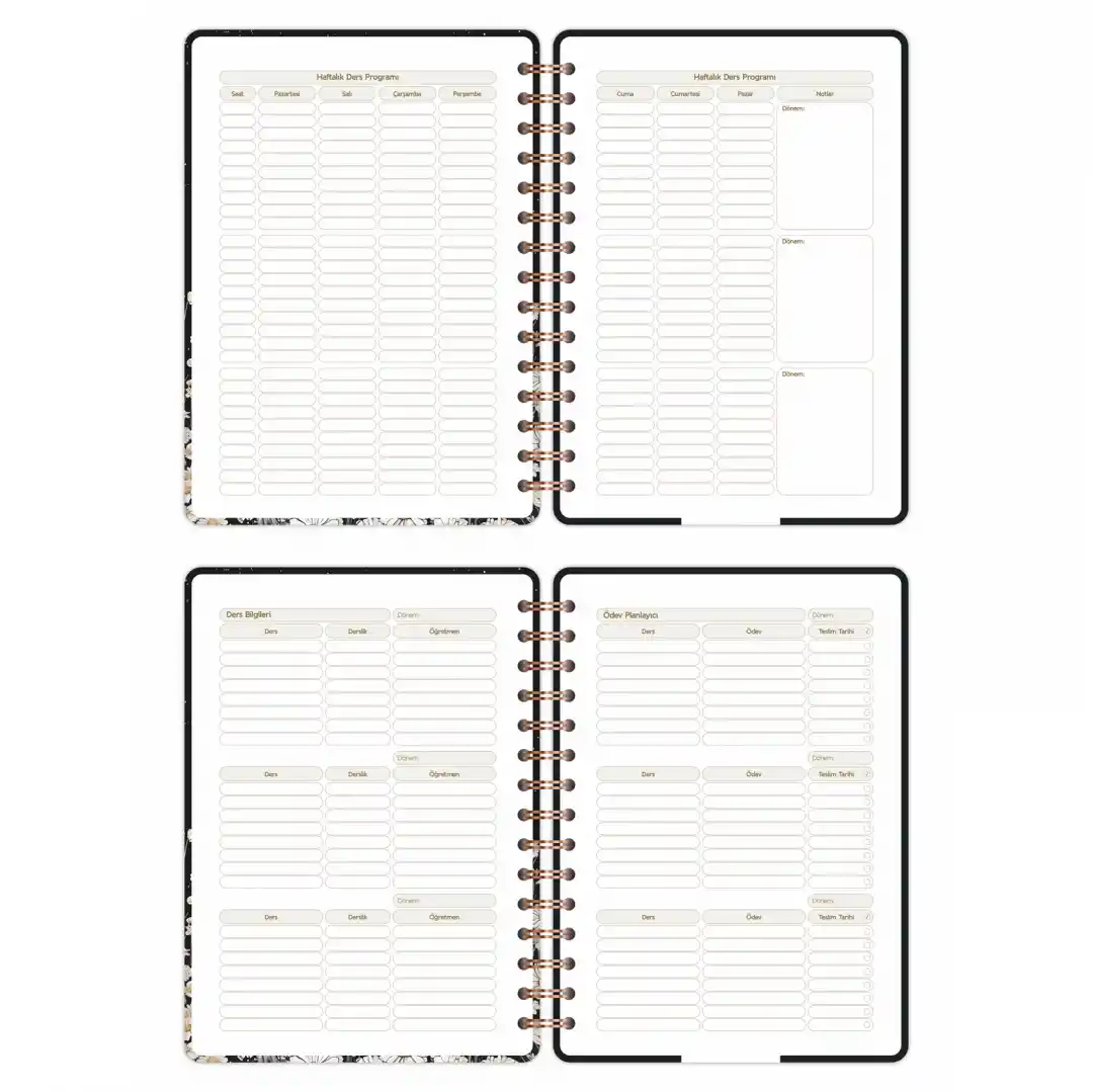 Haftalık ve aylık plan bölümleri ders, sınav ve projelerinizi takip etmenize yardımcı olurken; alışkanlık takibi, motivasyon duvarı, bütçe yönetimi ve ödev çizelgeleri gibi ek alanlar kişisel gelişiminizi destekler.