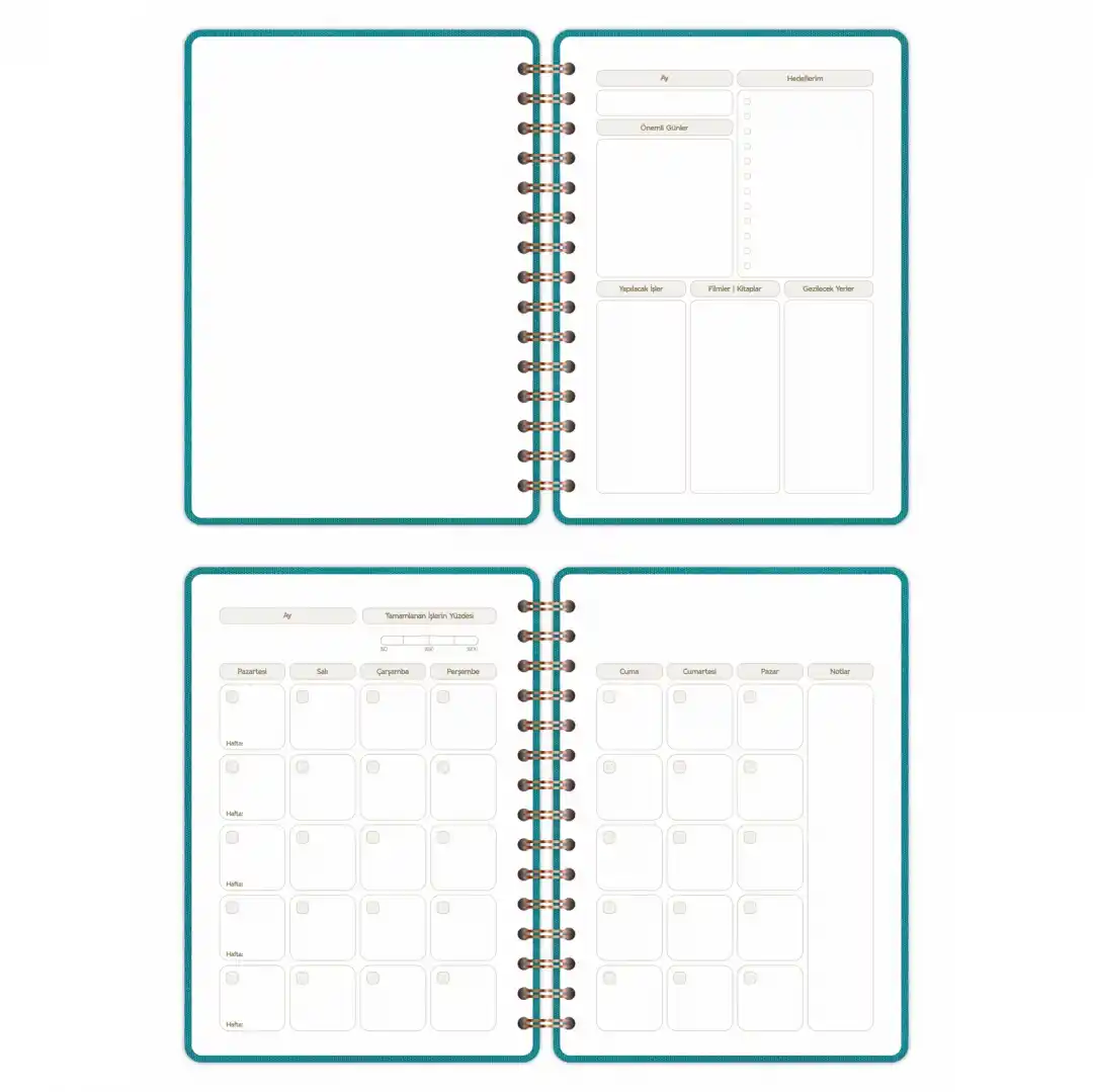 Haftalık plan bölümleri; işlerini, derslerini veya kişisel hedeflerini organize etmeni kolaylaştırırken, ek bölümler hayatına pratiklik katar: hedefler listeni yazabilir, yapılacak işlerini takip edebilir, seyahat planlarını kaydedebilir, film & dizi arşivini oluşturabilirsin. Ayrıca günlük su tüketimini işaretleyebileceğin çizelgeyle sağlıklı rutinlerini desteklersin.