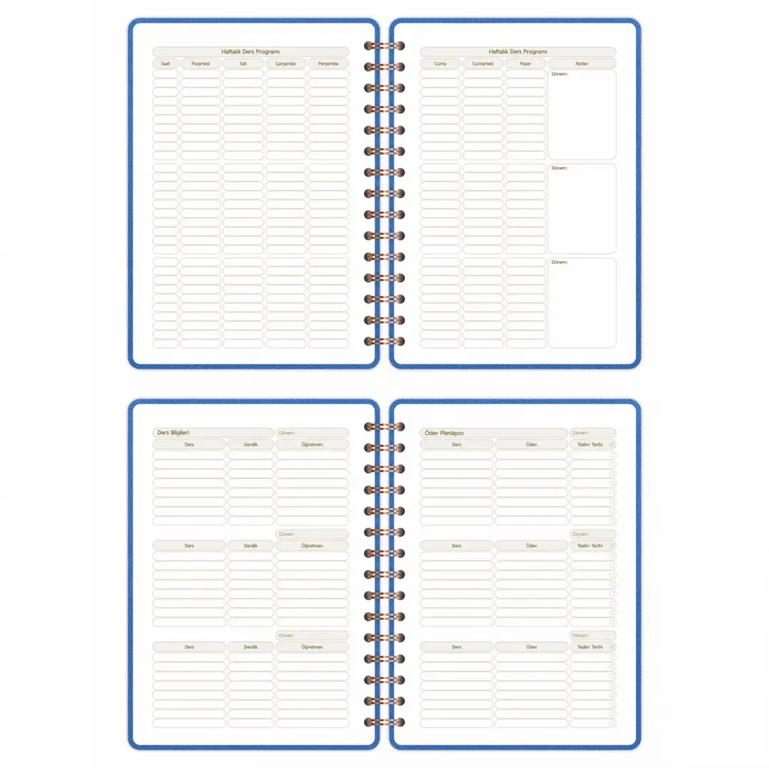 Haftalık ve aylık plan bölümleri ders, sınav ve projelerinizi takip etmenize yardımcı olurken; alışkanlık takibi, motivasyon duvarı, bütçe yönetimi ve ödev çizelgeleri gibi ek alanlar kişisel gelişiminizi destekler.