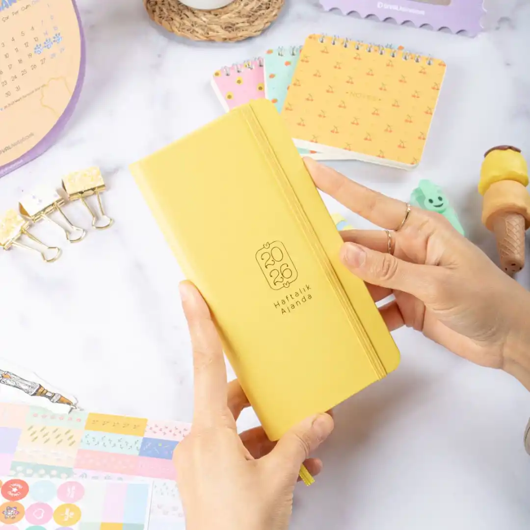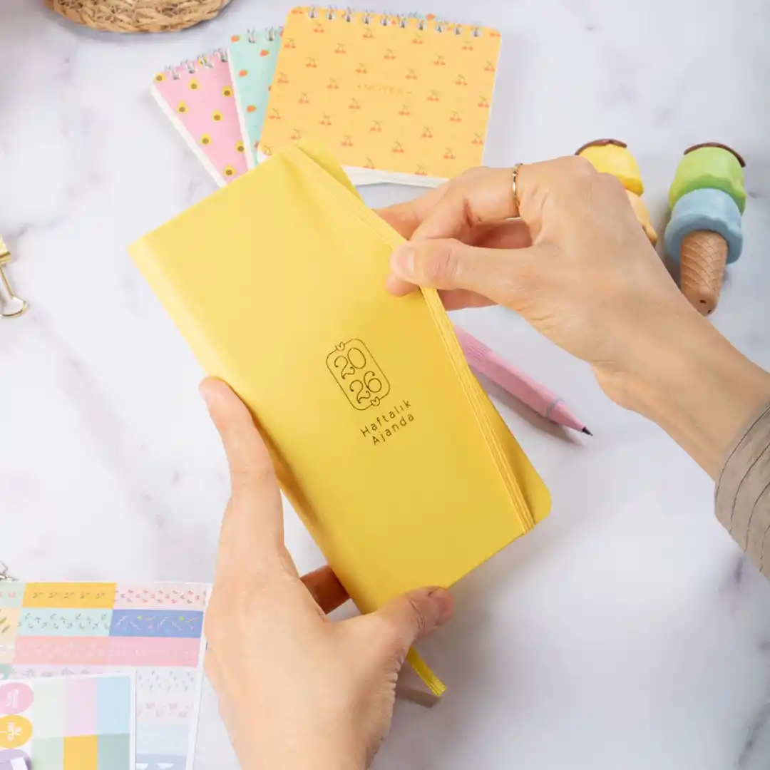 2026 haftalık ajanda, kuşe sert kapak tasarımıyla şık bir şekilde organize olmanızı sağlar. 9x18 cm boyutunda çanta boy olarak taşımada kolaylık sağlar.
