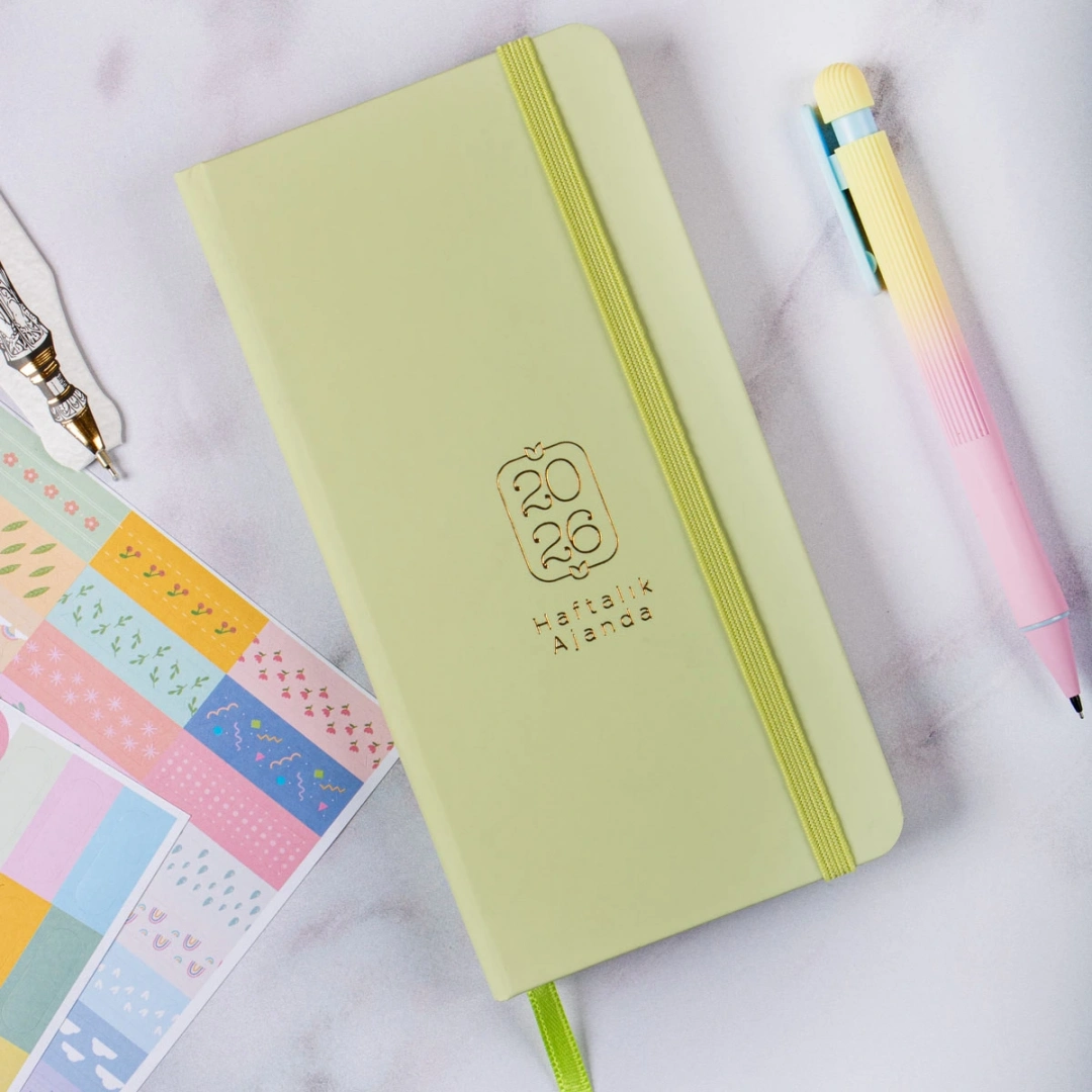 2026 haftalık ajanda, kuşe sert kapak tasarımıyla şık bir şekilde organize olmanızı sağlar. 9x18 cm boyutunda çanta boy olarak taşımada kolaylık sağlar.