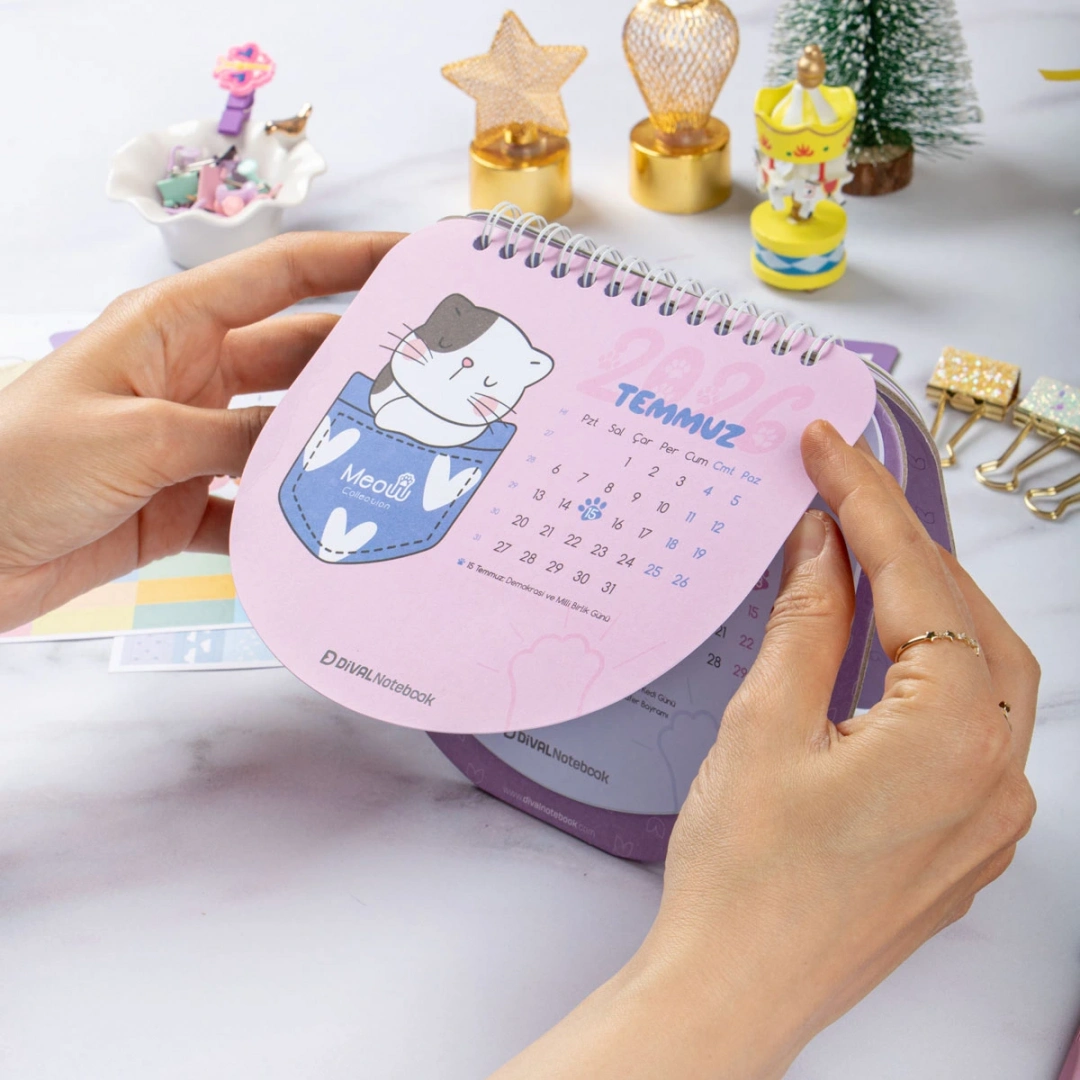 Dival Notebook’un özel tasarımı Masaüstü Kedili Hacıyatmaz Takvim, sevimli kedi illüstrasyonlarıyla masanı renklendirirken, dayanıklı hacıyatmaz formu sayesinde devrilmeden dimdik durur. Tatlı tasarımıyla dikkat çeken bu takvim, yalnızca bir masa objesi değil; aynı zamanda ruh halini yükselten günlük bir motivasyon kaynağıdır.