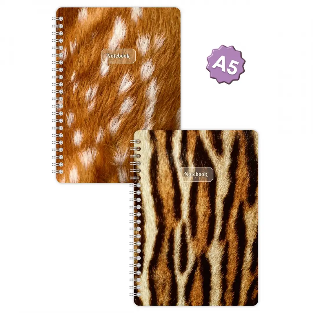 A5 Spiralli Karton Kapak 2'li Set Kareli Ders Programlı Not Okul Defteri - Ceylan, Kaplan: Hayvan deri desenli, vahşi doğa temasına sahip kullanışlı defter seti.