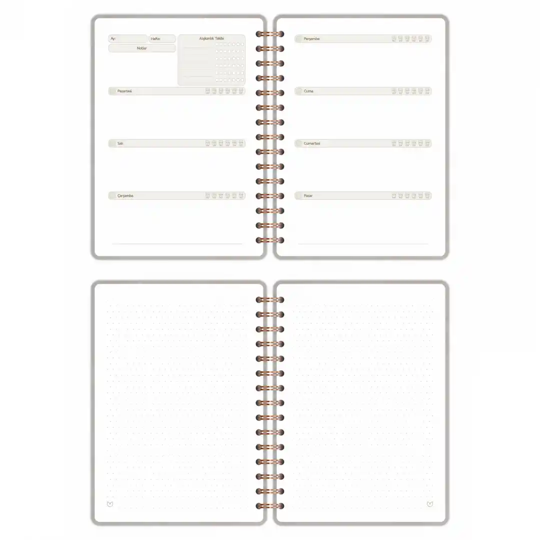 Şık vegan deri kapak tasarımı ve bakır yaldız baskısıyla sadece işlevsel değil, aynı zamanda estetik bir görünüm sunar. Dayanıklı spiralli yapısıyla her yerde rahatça açıp kullanabilir, notlarını güvenle tutabilirsin.