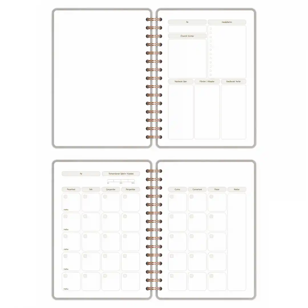 Haftalık plan bölümleri; işlerini, derslerini veya kişisel hedeflerini organize etmeni kolaylaştırırken, ek bölümler hayatına pratiklik katar: hedefler listeni yazabilir, yapılacak işlerini takip edebilir, seyahat planlarını kaydedebilir, film & dizi arşivini oluşturabilirsin. Ayrıca günlük su tüketimini işaretleyebileceğin çizelgeyle sağlıklı rutinlerini desteklersin.