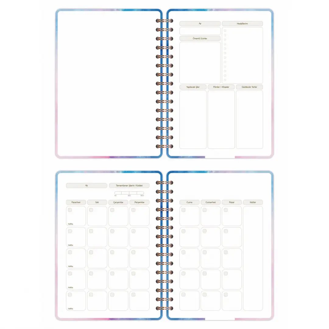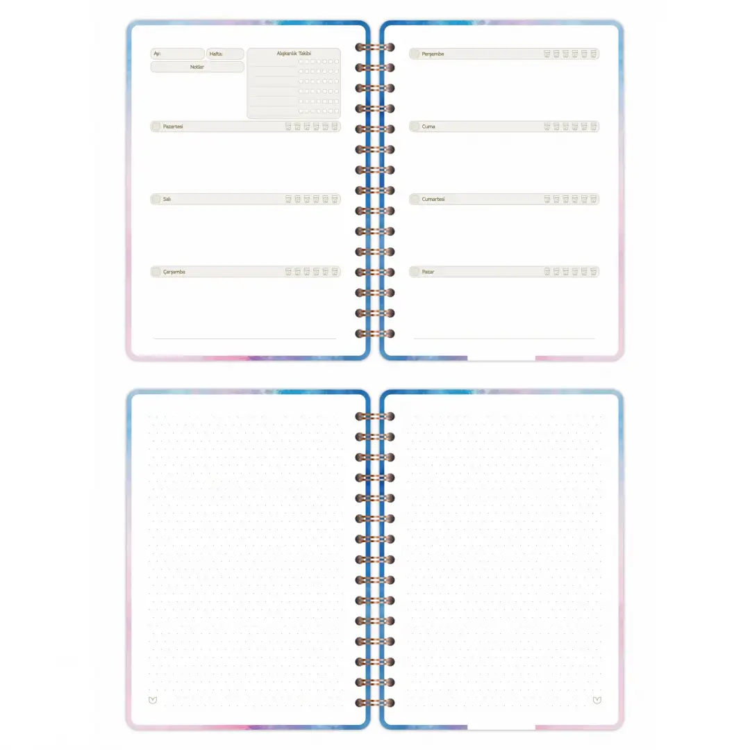 Haftalık plan bölümleri; işlerini, derslerini veya kişisel hedeflerini organize etmeni kolaylaştırırken, ek bölümler hayatına pratiklik katar: hedefler listeni yazabilir, yapılacak işlerini takip edebilir, seyahat planlarını kaydedebilir, film & dizi arşivini oluşturabilirsin. Ayrıca günlük su tüketimini işaretleyebileceğin çizelgeyle sağlıklı rutinlerini desteklersin.